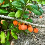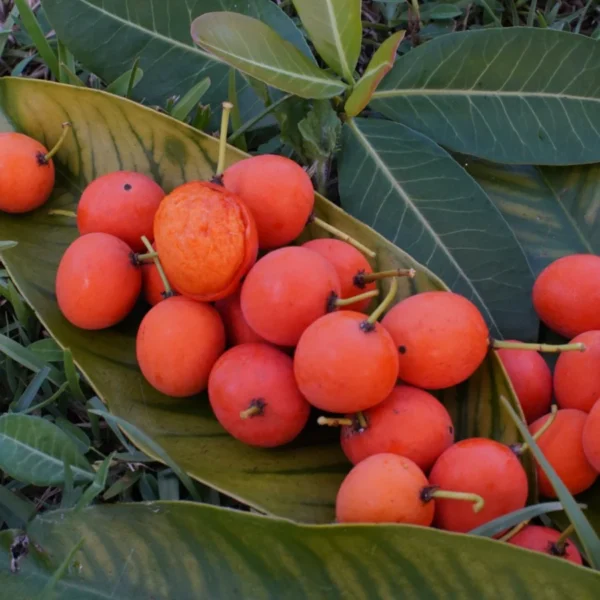 The tree produces small white or yellowish flowers, which are either male or female, meaning that cross-pollination between male and female plants is necessary for fruit production. The fruit is round to oval, about 1 to 2 inches in diameter, with a bright orange to reddish-orange skin when ripe. The flesh is soft, juicy, and orange in color, with a tangy and sweet flavor similar to a citrus-mango combination. Each fruit contains one or two large seeds.