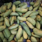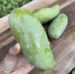 The fruit of the Mahachanok mango is easily recognizable for its long, slender, curved shape and vibrant, golden-yellow skin with an attractive reddish blush when exposed to the sun. Each fruit typically weighs between 12 to 16 ounces. The skin is thin and smooth, making it easy to peel when ripe. Inside, the flesh is fiberless, firm, and rich, offering a deep orange color and a sweet, floral flavor that’s often compared to a blend of mango, honey, and a touch of citrus. The flavor is consistent and well-balanced, appealing to both commercial growers and backyard enthusiasts.
