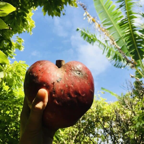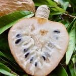 The tree produces fragrant, yellow-green flowers, often with reddish-brown markings, that give way to its iconic fruit. The fruit is heart-shaped or oblong, with a smooth or slightly bumpy skin that ranges in color from green to brownish-yellow or reddish when ripe. Inside, the creamy, pale-yellow to light-brown pulp surrounds numerous black seeds. The pulp is sweet and flavorful, often described as a blend of vanilla, pineapple, and caramel, making it a favorite among fruit enthusiasts.