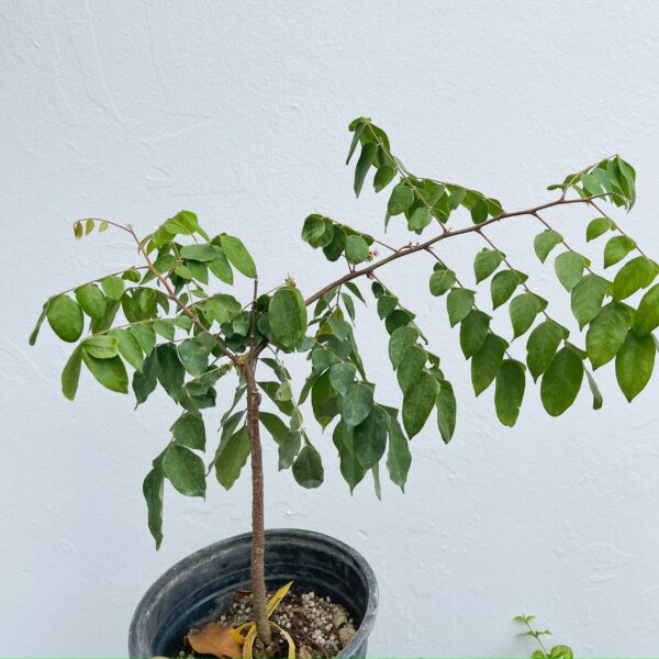 The grafted starfruit tree is a medium-sized evergreen tree that typically grows between 15 to 25 feet tall when mature. It has a bushy, rounded canopy filled with dense, dark green, glossy compound leaves that provide a lush, tropical appearance. Grafted trees often exhibit more uniform growth and can be pruned to maintain a compact size, making them ideal for smaller gardens or urban landscapes.
