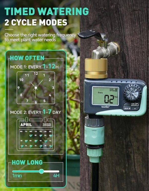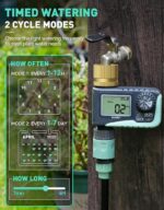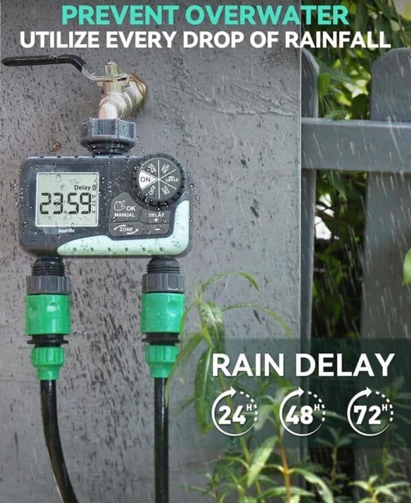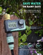The timer also includes a rain delay function, which helps conserve water by temporarily pausing the watering schedule during rainy periods. This ensures that your garden doesn’t get overwatered and helps save on water bills. Additionally, the manual watering option provides the convenience of on-demand watering without disrupting your programmed schedule, perfect for times when your garden needs a little extra hydration.
