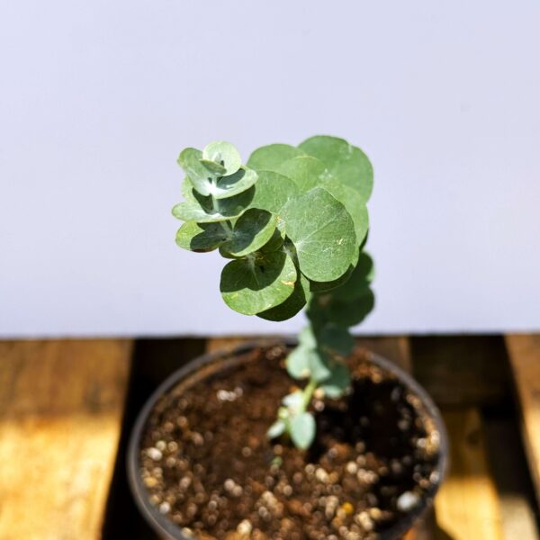 The Silver Dollar Gum is a small to medium-sized tree that typically grows between 20 to 40 feet tall, though it can reach up to 60 feet under ideal conditions. It has a slender, upright growth habit with a rounded canopy. The trunk is often straight, with rough, fibrous bark that peels in strips. One of its most distinctive features is its juvenile foliage, which consists of nearly circular, silvery-blue leaves that grow in pairs along the stems. As the tree matures, the leaves become longer and lance-shaped, although many gardeners prune it regularly to maintain the decorative juvenile foliage.